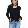 This knitwear garment is constructed with a textured knit fabric that provides flexibility while maintaining shape during wear. It features long sleeves and a defined neckline such as crew, V-neck, or high neck depending on the design. The silhouette may be fitted, relaxed, or oversized, influencing how it layers over base garments. The knit structure creates a soft surface and allows moderate stretch. This piece is suitable for indoor and outdoor use, particularly in cooler conditions where layering is required. It pairs with jeans, skirts, or trousers. The textured knit construction and structured form distinguish it from lightweight woven tops.